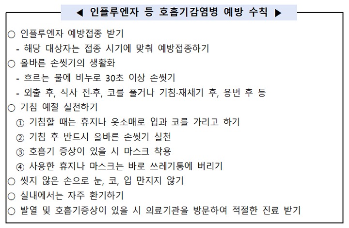 전문가들은 인플루엔자와 RSV 등 호흡기감염병이 동시에 유행하는 상황에서 고위험군의 백신 접종이 특히 중요하다고 강조한다. 마스크 착용, 손 씻기, 환기 등 기본 예방수칙 준수도 필요하다는 지적이다.