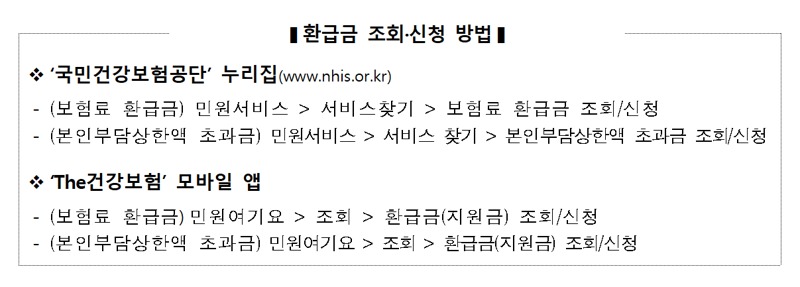 또한 보험료나 본인부담상한액 초과금 환급의 경우, 가입자가 본인 명의의 금융계좌를 미리 공단에 등록해두면 별도의 신청 절차 없이 자동 지급받을 수도 있다. 사전 계좌 등록은 공단 지사 방문 또는 고객센터를 통해 가능하다.