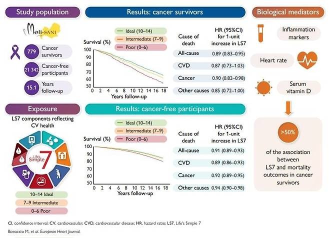 ◆ 출처 : European Heart Journal, Maria Benedetta Donati et al., ‘Life’s Simple 7 score and cardiovascular health in cancer survivors: the Moli-sani study’, http://dx.doi.org/10.1093/eurheartj/ehaf838