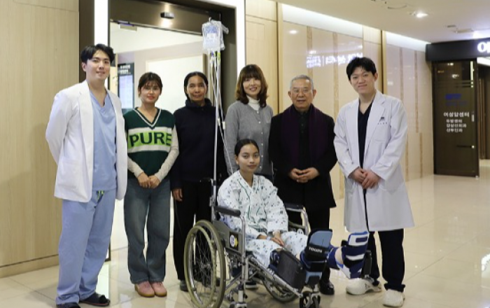 ▲ 하지재건 클리닉 정형화 교수(좌측 첫 번째)와 환자 ‘떼움 쿤떼아’(가운데) [사진=순천향대 부천병원]선천성 만곡족과 혈관 기형, 자가면역질환으로 양측 발 절단 위기에 놓였던 캄보디아 환자가 국내 의료진의 고난도 수술로 보행이 가능한 상태로 회복했다.순천향대학교 부천병원은 선천성 만곡족을 앓던 캄보