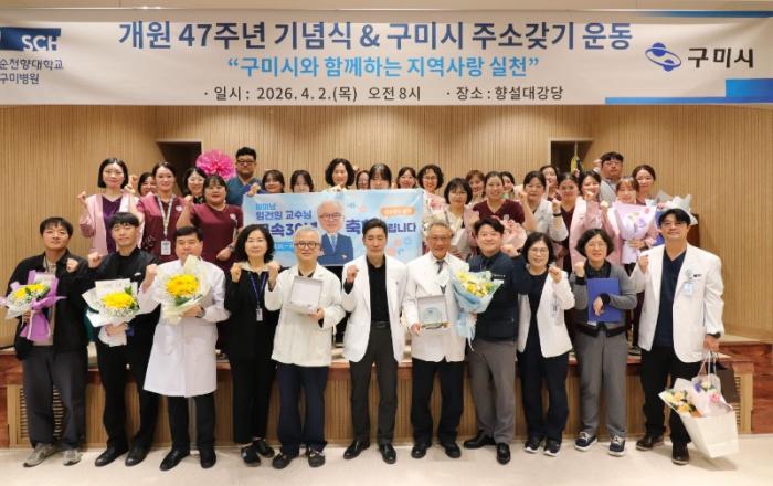 ▲ [사진=순천향대학교 구미병원](헬스케어저널=구재회 기자) 순천향대학교 구미병원(병원장 김성호)은 2일 오전 8시 본원 향설대강당에서 개원 47주년 기념식을 개최했다고 밝혔다.이날 행사에는 김장호 구미시장과 김성호 병원장을 비롯한 주요 보직자 및 교직원 150여 명이 참석했다.기념식은 국민의