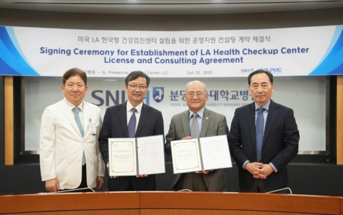 ▲ 22일 분당서울대병원이 미국 SL건강검진센터(SL Preventive Medical Center)와 LA 한국형 건강검진센터 운영지원 자문 계약을 체결한 후 기념사진을 촬영하고 있다. (왼쪽부터) 송정한 분당서울대병원장, 김영태 서울대병원장, SL건강검진센터 박도원 회장, 정상교 대표 (사진=분당서울