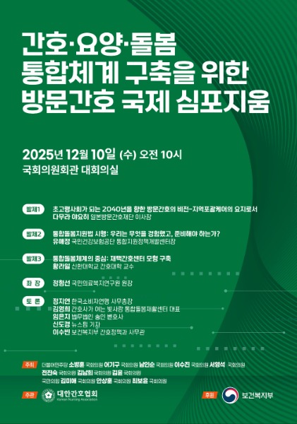 이번 ‘간호·요양·돌봄 통합체계 구축을 위한 방문간호 국제 심포지움’은 더불어민주당 소병훈·어기구·이수진 의원, 국민의힘 김미애 의원 등 여야 다수 의원이 공동 주최하고 대한간호협회가 주관한다. 보건복지부가 후원하며 간호 전문가, 학계, 정책 관계자 등 약 500명이 참석할 예정이다.
