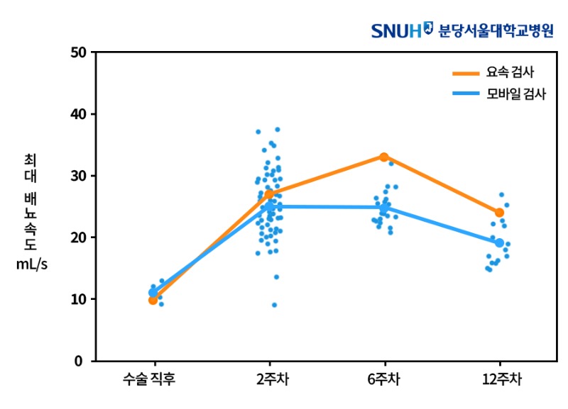 연구 결과, 수술 전 평균 13.0mL/s였던 최대 배뇨 속도는 수술 후 12주 시점에 20.9mL/s로 개선됐으며, 이 변화 양상은 모바일 앱과 병원 요속 검사 모두에서 유사하게 확인됐다. 환자가 체감하는 증상 개선 정도와 앱 측정 결과 간에도 높은 일치도가 나타났다.