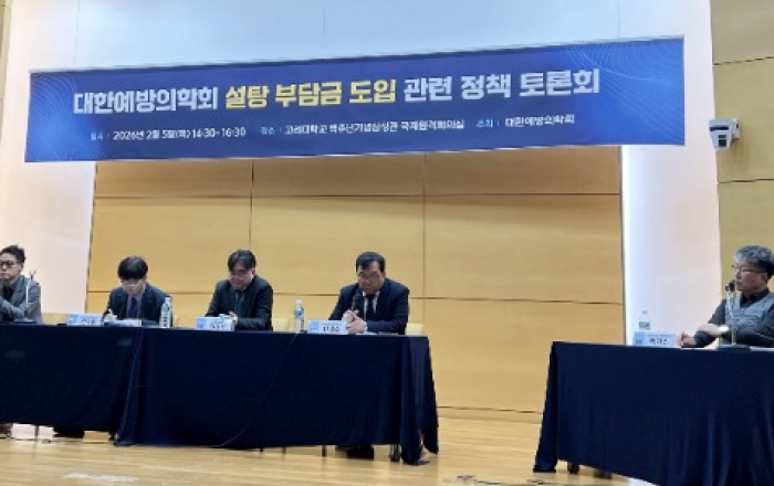 ▲ 대한예방의학회는 5일 고려대학교 백주년기념삼성관에서 설탕 부담금 도입을 통한 공공의료 재원 확보 방안을 논의하는 정책 토론회를 열었다. [사진=고려대학교 의과대학]대한예방의학회가 설탕 부담금 도입을 통한 공공의료 재원 확보 방안을 주제로 정책 토론회를 열고, 소아청소년 비만과 당류 섭취 문제를 중심으로 제도 도입 필요성을 논의했다.대한예방의학회(이사장 윤석준 고려대학교 의과대학 예방의학교실 교수)는 5일 고려대학교 백주년기념삼성관 국제원격회의실에서 ‘설탕 부담금 도입 정책 토론회’를 개최했다고 밝혔다. 이번 토론회는 최근 설탕 ...