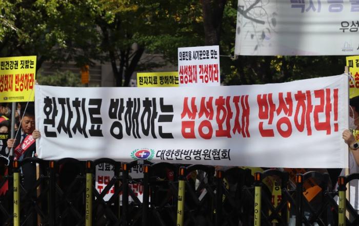 ▲한방병협 등 한방의료기관 600여 곳이 삼성화재의 무분별한 소송 남발을 규탄하며 국민 건강권 침해를 지적했다. [사진=한방병협]대한한방병원협회(한방병협)와 한방 의료기관들이 삼성화재의 ‘소송 남발’을 규탄하고 나섰다. 한방병협은 23일 서울 서초구 삼성화재 강남 사옥 앞에서 제2차 항의 집회를 열고,