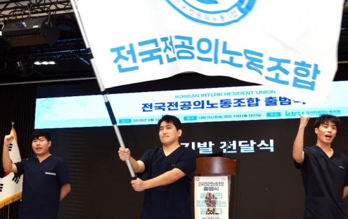 ▲지난달 14일 서울 용산구 대한의사협회에서 열린 전국전공의노동조합 출범식에서 유청준 위원장이 노조 깃발을 펄럭이고 있다. [사진=연합뉴스]전공의 10명 중 8명이 과로로 건강이 악화됐다고 호소한 것으로 조사됐다. 특히 10명 중 2명은 여전히 주 80시간을 초과해 근무하는 것으로 나타나, 전공의법 개정