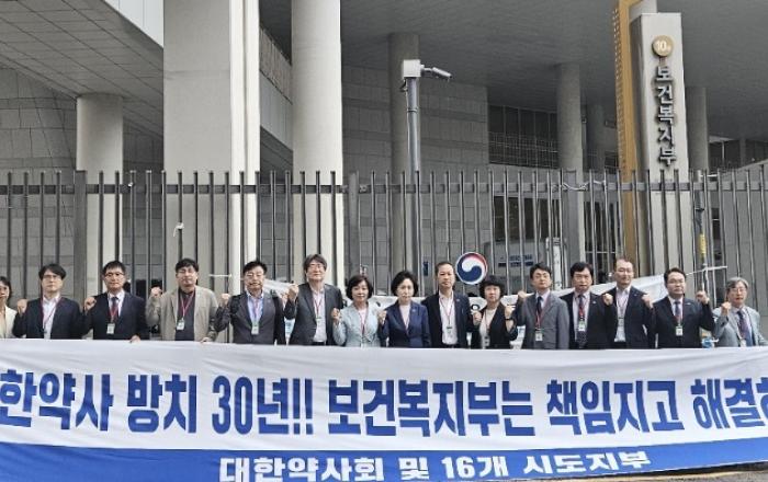 ▲ 대한약사회가 17일 복지부를 항의 방문해 한약사 문제의 근본적 해결을 촉구했다. [사진=대한약사회]대한약사회(회장 권영희)는 17일 16개 시도지부장들과 함께 세종시 보건복지부 약무정책과를 항의 방문하고, 한약사 문제에 대한 정부의 조치를 촉구했다.권영희 회장은 이 자리에서 “국민의 건강과 면허체계의