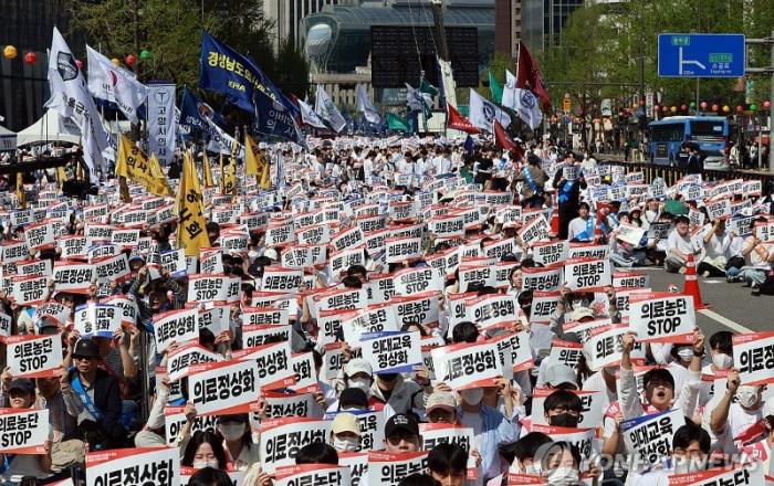 ▲감사원은 의대정원 2천명 증원 과정 전반의 절차 미흡을 지적했고, 전공의단체는 정부의 책임을 우선 요구했다. 사진은 지난 4월 세종대로에 모인 의사와 의대생 [사진=연합뉴스]감사원이 지난해 추진된 의대 입학정원 2천명 일괄 증원 과정에서 근거 산출·의사결정·대학별 배정 등 전반적 절차가 미흡했다고 판단
