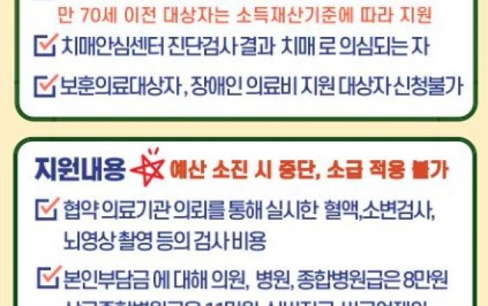 ▲ [자료=동작구]동작구가 서울시 자치구 가운데 처음으로 치매 의료비를 자체 지원하는 ‘동작형 치매의료비 지원 사업’을 시행한다.동작구는 3월 3일부터 만 70세 이상(1956년 12월 31일 이전 출생) 구민을 대상으로 치매검진비와 치매치료비를 지원한다고 27일 밝혔다.이번 사업은 기존 정부 지원에서