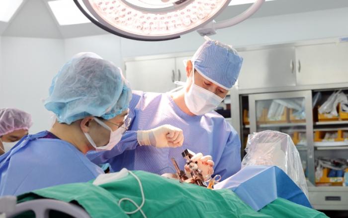▲뇌심부자극술(DBS)로 중증 파킨슨병 환자의 운동기능이 개선되고 약물 복용량도 크게 줄어든 것으로 나타났다. 사진은 신경외과 박광우 교수(우측)가 뇌심부자극술을 시행하는 모습 [사진=가천대 길병원]중증 파킨슨병 환자들이 뇌심부자극술(DBS)을 통해 운동기능이 크게 개선되고 약물 복용량도 대폭 감소한 것
