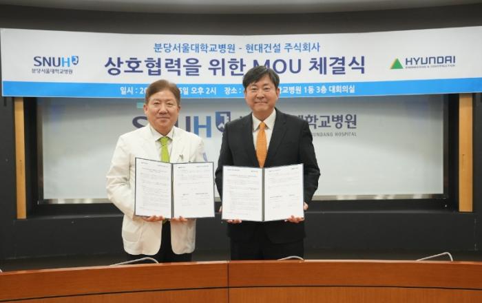 ▲ (왼쪽부터) 송정한 분당서울대병원장과 김재영 현대건설 기술연구원장이 기념 촬영을 하고 있다. [사진=분당서울대병원]분당서울대병원은 6일 현대건설과 헬스케어 플랫폼 개발을 위한 업무협약(MOU)을 체결했다고 밝혔다.이날 오후 2시 병원 대회의실에서 열린 협약식에는 송정한 분당서울대병원장과 김재영 현대건