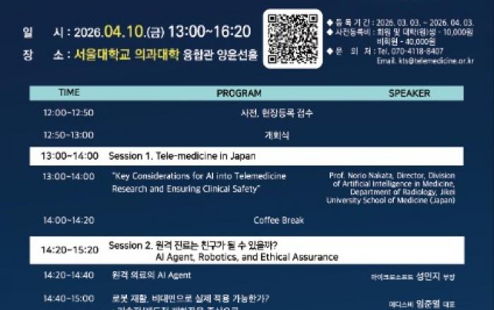 ▲ KTS 2026 한국원격의료학회 춘계 학술대회 포스터(헬스케어저널=부동희 기자) 한국원격의료학회는 지난 10일 서울대학교 의과대학 융합관 양윤선홀에서 ‘AI와 1차 진료에서의 원격의료’를 주제로 2026년 춘계학술대회를 개최했다고 밝혔다.이번 학술대회는 인공지능(AI) 기술 발전에 따른 원격의료의 변
