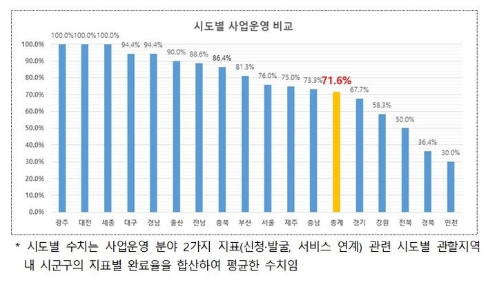 반면 경기·강원·전북·경북·인천 등 일부 지역은 상대적으로 준비도가 낮은 편으로 나타났다. 전체 229개 시군구 가운데 116곳은 조례·조직·인력·서비스 연계를 모두 갖췄지만, 시범사업에 늦게 참여한 지자체를 중심으로 준비가 미흡한 곳도 적지 않았다.